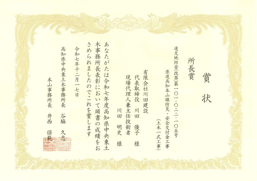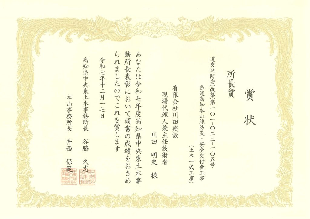 令和6年3月から令和7年3月に施工した「県道高知本山線 防災・安全交付金工事」において、高知県中央東土木事務所長様より所長賞を頂きました。
